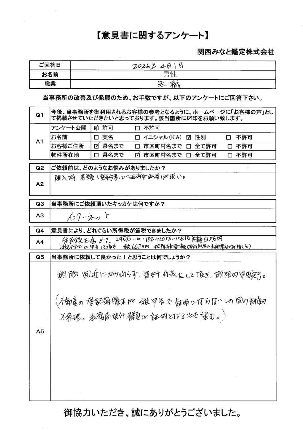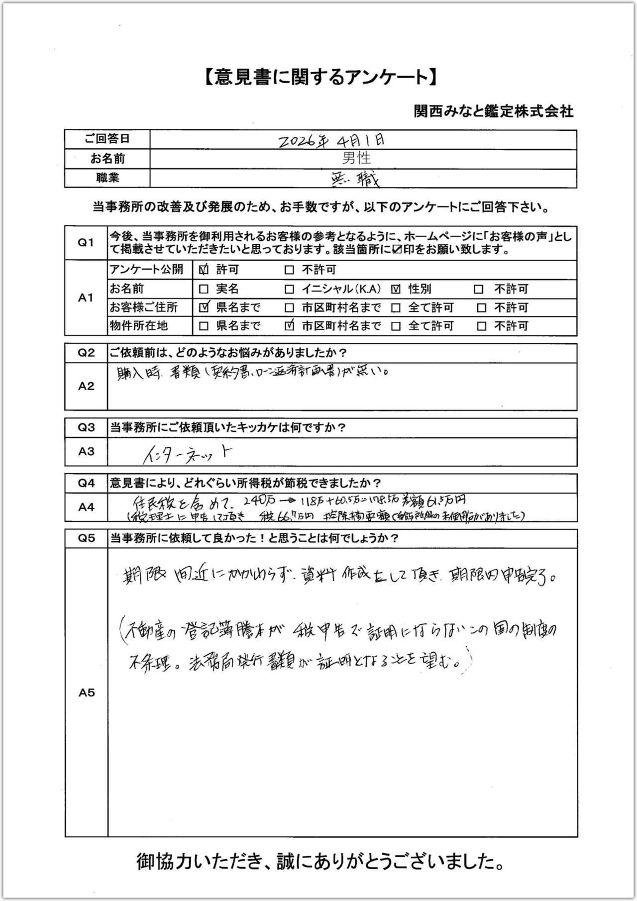 税理士の先生もご紹介いただき、確定申告が完了し、所得税の節税額は想定を超える約260万円でした。思い切って関西みなと鑑定(株)に相談して本当に良かったと思います。